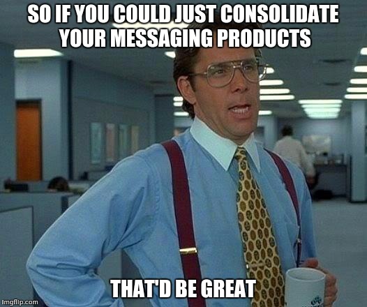 You know what you actually need Google? Two apps, at the most. One for consumers, one for businesses. Both of which are cross-platform, handle video, and have web clients. The consumer version being installed by default on Android, handling SMS (ya know, Hangouts?), being Android's equivalent to Apple's iMessage, and being a valid competitor to Skype.