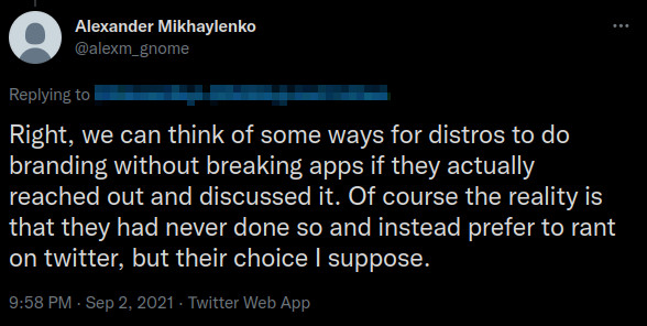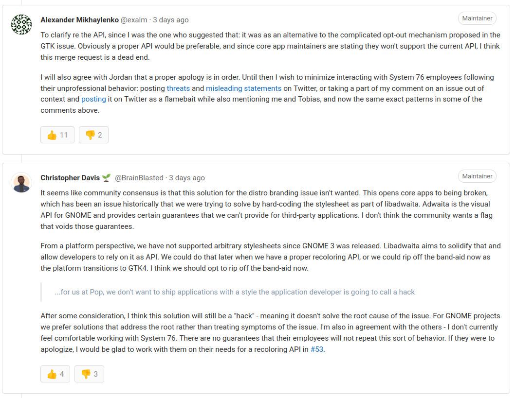 On social media, it has not been any better, with some GNOME developers dismissing concerns by just claiming that nobody from System76 ever engaged with GNOME on the matter, which is materially false, and made remarks that these developers "instead prefer to rant on twitter".