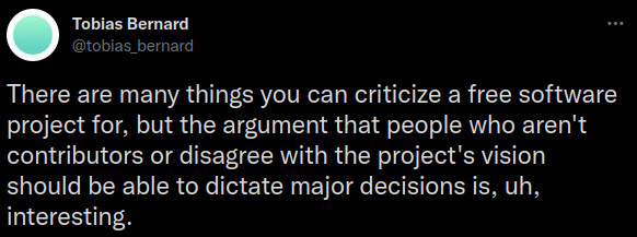 Other developers have opted to make remarks that more-or-less come down to "if you don't contribute, your opinion doesn't matter", which is incredibly dismissive of all the people that are passionate about open source, but have no technical means or capabilities to actually get involved.